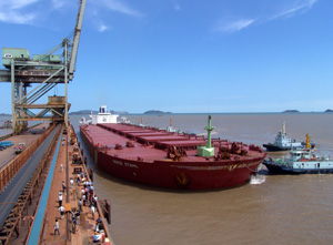 9月7日13时14分,一艘海上巨无霸36.4万余吨挪威籍散装货船“博格斯坦”号(BERGE STAHL)装载着35.6万多吨巴西铁矿砂,稳稳地靠上浙江省舟山口岸马迹山港口。