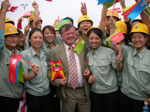 图为联合国开发计划署官员侯伟泰先生与日照港职工欢庆新丝路明珠城市申报启动仪式