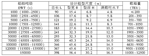 2、集装箱码头设计标准以船舶吨级(DWT)对应的设计船型尺度为控制标准,其载箱量为参考值。