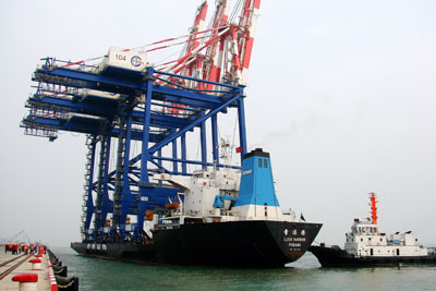厦门港嵩屿集装箱码头有限公司第二批3台额定起重量为65吨、外伸距66米、起升高度42米、轨距35米的岸桥3月11日下午由“幸运港”号货轮装载,顺利到港。该公司首批3台岸桥已于今年1月份到港并正在调试中。图为新岸桥抵港情景。