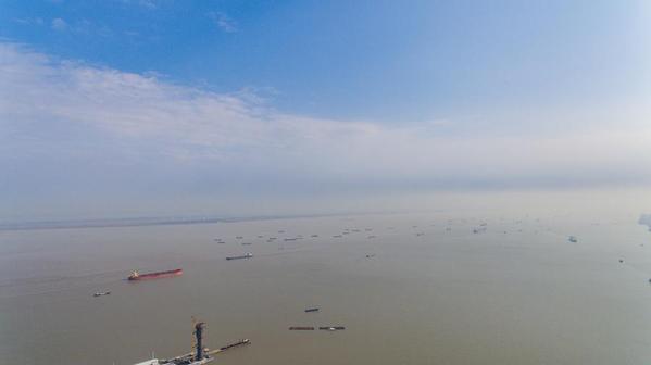 还未走近吴淞口国际邮轮港港,远远便能看到繁忙的船只穿梭在江面上。新华网吴恺摄
