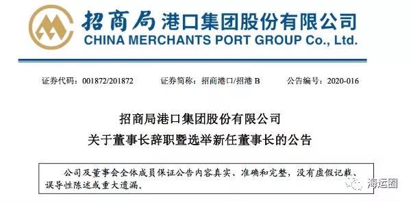 招商局港口集团股份有限公司(以下简称“公司”)董事会于2020 年 1 月 31 日收到公司董事长付刚峰先生提交的书面辞呈。因工作变动原因,付刚峰先生向董事会申请辞去公司董事长、董事职务,辞去上述职务后,付刚峰先生将不在公司担任任何职务。