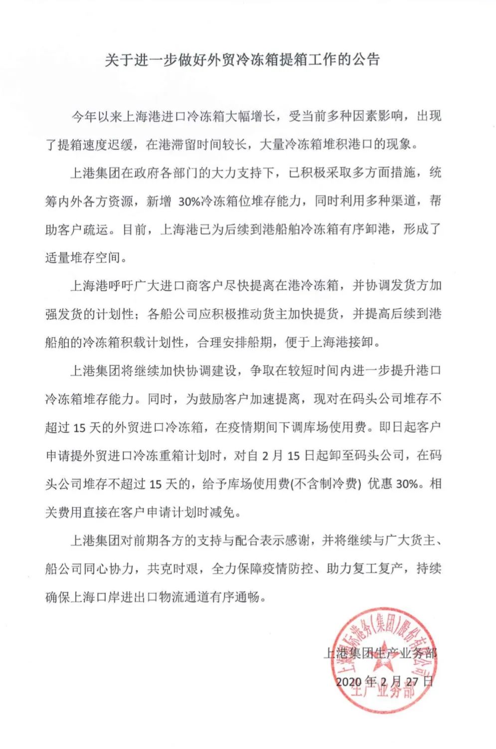 为鼓励客户加速提离,上港集团现对在码头公司堆存不超过15天的外贸进口冷冻箱,在疫情期间下调库场使用费。即日起客户申请提外贸进口冷冻重箱计划时,对自2月15日起卸至码头公司,在码头公司堆存不超过15天的,给予库场使用费(不含制冷费) 优惠30%。相关费用直接在客户申请计划时减免。