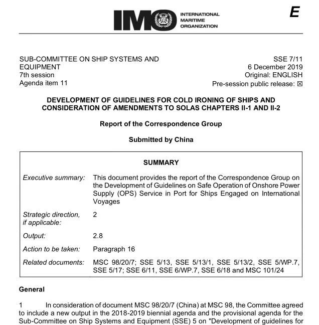 2020年3月2日至3月6日,国际海事组织(IMO)船舶系统与设备分委会第7次会议(SSE7)在英国伦敦IMO总部召开。交通运输部海事局组织广东海事局、上海海事局、部水运科学研究院等单位研究完成的《国际航行船舶岸电安全操作导则》在会上顺利获得通过。