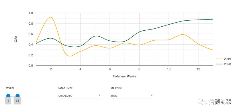 去年同一时间,根据Container Xchange提供的40DC干柜的CAx(集装箱可用指数)值为0.29,说明集装箱数量不足,而2020年目前的CAx值为0.88,说明集装箱数量过剩。【集装箱可用性指数涵盖了通过Container xChange移动和跟踪的数百万个集装箱。集装箱xChange是一个在线平台,能够帮助货运代理更好更快的找到可用空箱。】