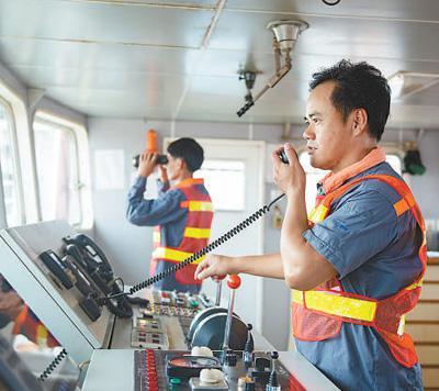 3月27日,广州港的“穿梭巴士”驾驶室内,船长在与调度人员联系。罗艾桦 黎其骏摄影报道