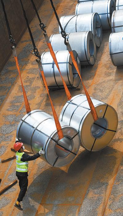 3月23日,武汉市花山港全面复工。图为工作人员操作门座式起重机吊装钢材。李子云摄(人民视觉)