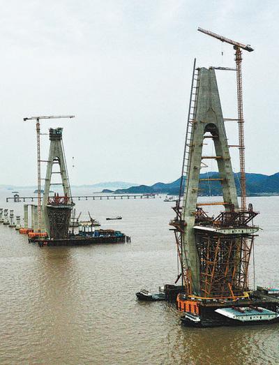 3月23日,随着两段钢箱梁的就位,浙江宁波舟山港主通道舟岱大桥第DSSG01标段正式开始桥面吊机悬臂拼装施工。姚 峰摄(影像中国)