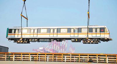 3月18日,山东青岛港西联码头,出口新加坡的地铁列车正在装船。俞方平摄(影像中国)