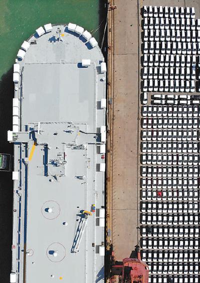 3月28日,江苏连云港港东方公司码头,一艘大型货轮准备装载车辆出口沙特。王 春摄(影像中国)