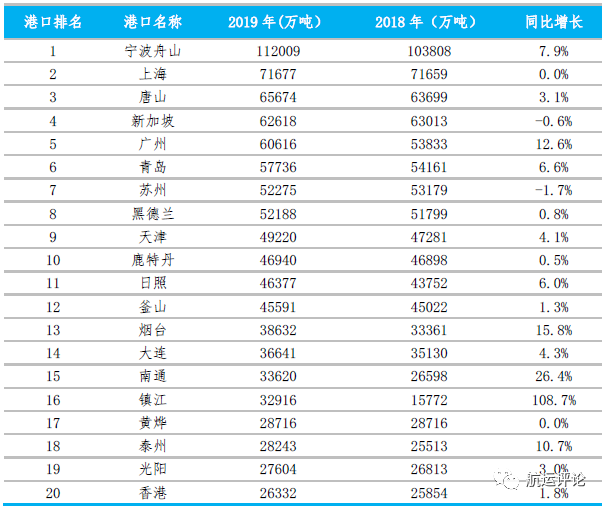 从全球货物吞吐量排名前20港口来看,中国港口占据3/4席位,有15个中国港口进入全球货物吞吐量港口Top20。其中,受益于中国内地基础建设进程加快,矿物性建筑材料运输需求大幅增加,中国内河港口增速表现抢眼,2019年中国内河港口完成货物吞吐量47.6亿吨,增速为19.4%,镇江港、阜阳港、淮南港等内河港口货物吞吐量与2018年相比翻倍。除此之外,宁波舟山、广州、烟台等沿海港口增速也表现强劲。国际港口中,受国际经贸环境不利影响,鹿特丹、黑德兰、釜山保持低速增长,新加坡港口生产增速跌入负增长区间。