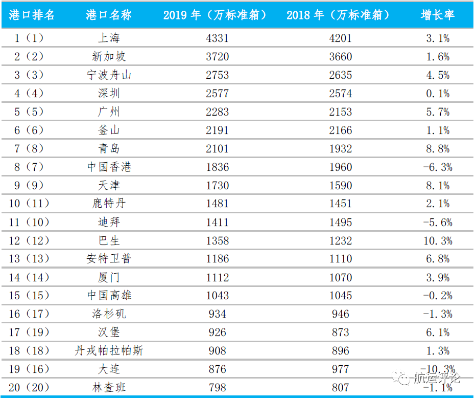 2019年,全球20大集装箱港口排名整体较去年相比变化不大,除个别港口名次出现小幅度波动外,其余港口排名基本趋于稳定。受全球经贸环境恶化影响,全球20大港口集装箱吞吐量增速普遍放缓,香港(-6.3%)、迪拜(-5.6%)、大连(-10.3%)、长滩(-5.7%)增速下跌明显,香港港和长滩港主要受中美贸易战影响,香港还受持续大规模抗议示威活动的影响,导致港口生产不佳。青岛(8.8%)、天津(8.1%)、巴生(10.3%)、汉堡(6.1%)增速表现良好,青岛港受益于山东省港口整合利好,集装箱吞吐量增速表现强劲;广州港得益于外贸航线增加,国际大型船舶到港明显增多,外贸集装箱源增多,推动集装箱吞吐量大幅增长;而汉堡港得益于汉萨同盟城市与美国、加拿大、墨西哥连接起来的新班轮服务,使得汉堡港成为枢纽,增加集装箱运输量,加之欧盟与新加坡的贸易协定进一步促进汉堡港海上贸易量的增长。