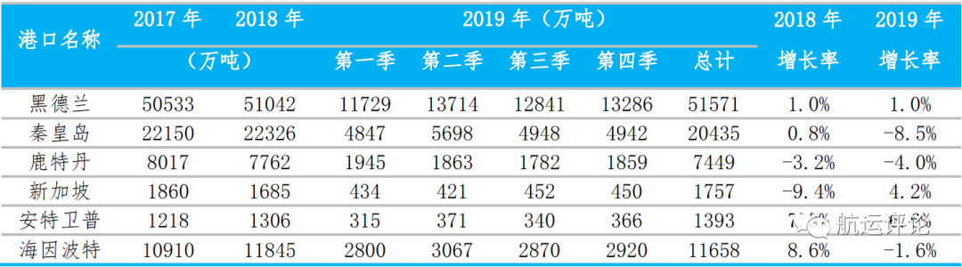2019年,铁矿石贸易需求下降,全球主要干散货和小宗散货海运量为52.9亿吨,同比增长1.1%。主要统计港口中,受中国对澳大利亚煤炭进口量大幅下跌影响,海因波特港口煤炭吞吐量增速大幅下滑,同比下降10.2个百分点陷入负增长区间。受澳大利亚飓风天气以及黑德兰港口大规模计划性检修影响,黑德兰港全年铁矿石吞吐量增速延续去年低增长态势。受荷兰和德国太阳能、风能、天然气发电量增加,煤炭在其发电厂中所占比例大幅降低影响,鹿特丹港煤炭吞吐量增速同比大幅下降14.8%。受此影响,鹿特丹港2019年完成干散货吞吐量7449万吨,同比下降4.0%,并未改变上年度颓势。受巴西淡水河谷尾矿坝决堤事故影响,铁矿石产量受到冲击,此外受非洲猪瘟影响,中国生猪存栏量大幅下降,导致中国大豆需求明显下降,使得2019年中国从巴西进口大豆量5767万吨,同比下降12.8%。在此背景下,巴西港口干散货吞吐量同比下降5.1%至68022万吨。