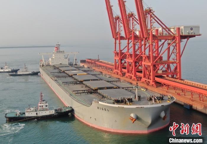 铝矾土运载船“猎户座”轮在山东港口烟台港进行接卸作业。山东港口烟台港供图