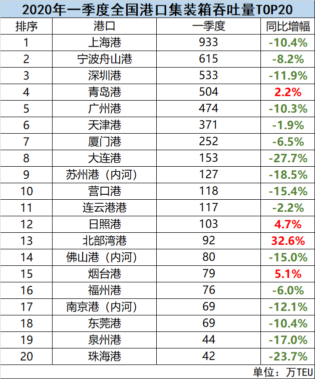 全国港口集装箱吞吐量排名如下图所示。前十大港口中,仅有青岛港出现2.2%的增长。11-20位的排名中,北部湾港则出现了高达32.6%的增幅,笑傲全国港口。
