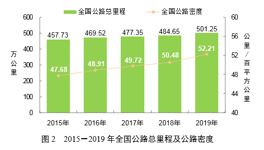 年末全国公路总里程501.25万公里,比上年增加16.60万公里。公路密度52.21公里/百平方公里,增加1.73公里/百平方公里。公路养护里程495.31万公里,占公路总里程98.8%。