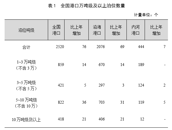年末全国港口拥有万吨级及以上泊位2520个,比上年增加76个。其中,沿海港口万吨级及以上泊位2076个,增加69个;内河港口万吨级及以上泊位444个,增加7个。
