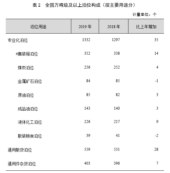 全国万吨级及以上泊位中,专业化泊位1332个,比上年增加35个;通用散货泊位559个,增加28个;通用件杂货泊位403个,增加7个。