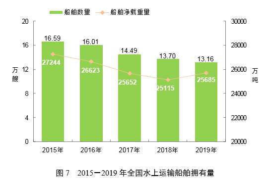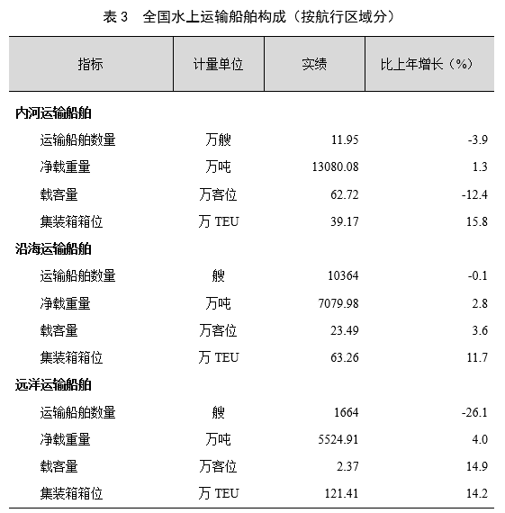 年末全国拥有水上运输船舶13.16万艘,比上年下降4.0%;净载重量25684.97万吨,增长2.3%;载客量88.58万客位,下降8.0%;集装箱箱位223.85万标准箱,增长13.8%。