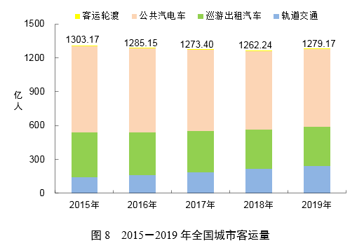 全年完成城市客运量1279.17亿人,比上年增长1.3%。其中,公共汽电车完成客运量691.76亿人,下降0.8%,其中BRT完成客运量17.47亿人,完成公共汽电车运营里程354.13亿公里,增长2.3%;轨道交通完成客运量238.78亿人,增长12.2%,完成运营车公里41.43亿车公里,增长17.5%;巡游出租汽车完成客运量347.89亿人,下降1.1%;客运轮渡完成客运量0.73亿人,下降9.0%。