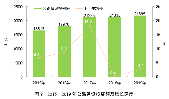 全年完成公路建设投资21895亿元,比上年增长2.6%。其中,高速公路建设完成投资11504亿元,增长15.4%;普通国省道建设完成投资4924亿元,下降10.3%;农村公路建设完成投资4663亿元,下降6.5%。