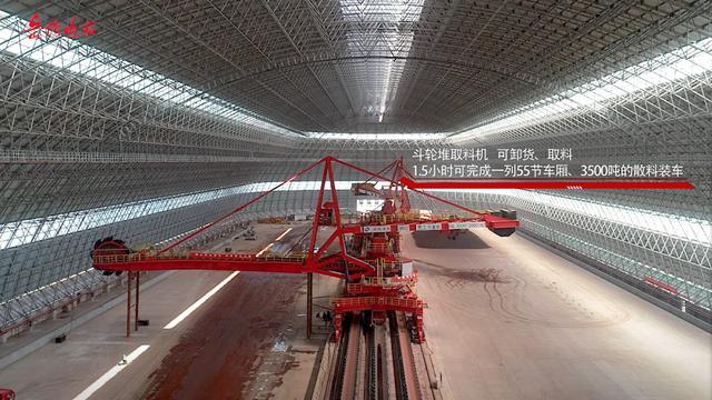 该项目建成投产后,到港船舶从码头卸船,货物可以通过皮带机运送到全封闭“胶囊”仓库,再通过堆料机、取料机装卸到火车上。