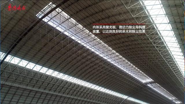 顶层采用错层结构,达到通风效果。是目前亚洲最长、最高、面积最大的网架结构港口散货料仓,也是长江流域首个巨型“胶囊”形散货仓库,单跨跨径位居全国第二。