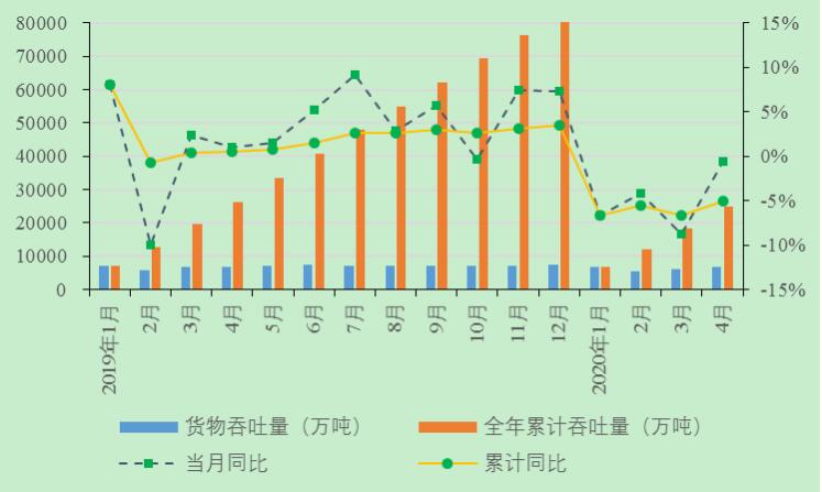 4月份完成货物吞吐量6774.01万吨,与去年同比下降0.6%,与上月环比上升8.6%,其中出港3055.73万吨,进港3718.28万吨,与去年同比,二项指标分别下降1.8%、上升0.4%,与上月环比分别上升12.1%、上升5.9%。自年初累计完成货物吞吐量25021.45万吨,与上年同比下降5.1%。