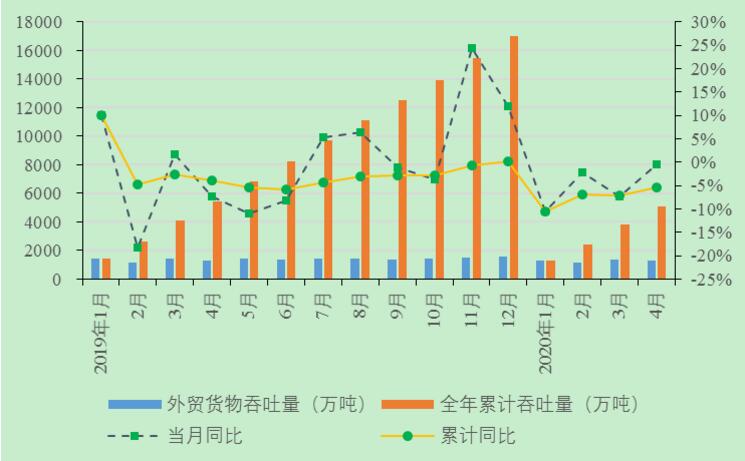 4月份完成外贸货物吞吐量1321.27万吨,与上年同比下降0.5%,与上月环比下降2.4%,其中出港334.17万吨,进港987.10万吨,与上年同比,二项指标分别下降9.5%、上升2.9%,与上月环比分别下降3.7%、下降2.0%。自年初累计完成外贸货物吞吐量5113.39万吨,与上年同比下降5.4%。