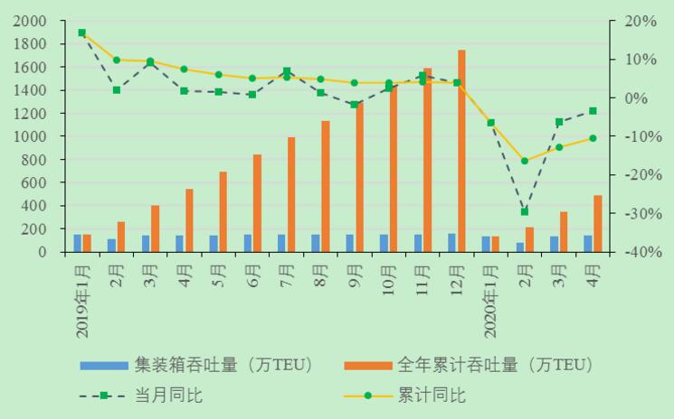 4月份完成集装箱吞吐量138.88万TEU,与上年同比下降3.4%,与上月环比上升5.2%,其中出港71.68万TEU,进港67.20万TEU,与上年同比,二项指标分别上升1.2%、下降7.8%,与上月环比分别上升8.9%、1.5%。其中外贸58.07万TEU,内贸80.81万TEU,与上年同比,二项指标分别下降3.6%、下降3.2%,与上月环比分别下降5.3%、上升14.3%。自年初累计完成集装箱吞吐量487.31万TEU,与上年同比下降10.4%。