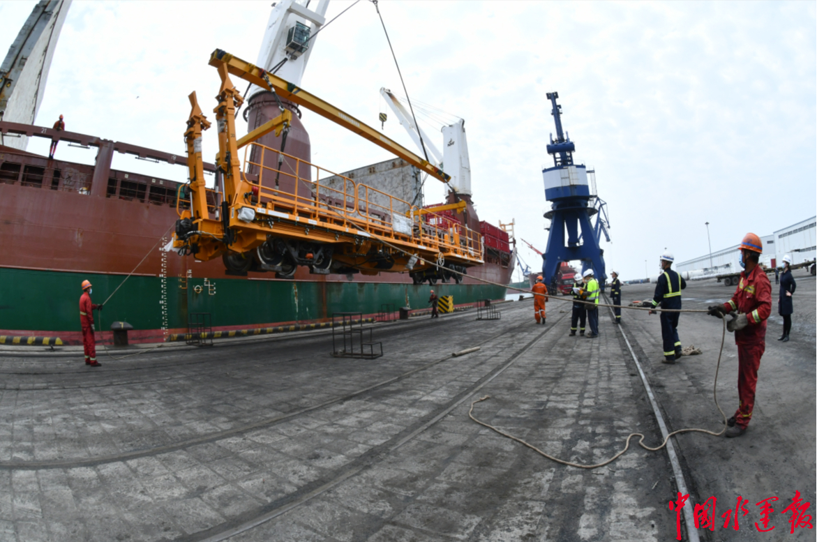 “下一辆规格43吨,注意更换吊点!”“起吊保持平稳,保证质量!”在现场作业人员紧张有序的指挥下,船吊吊钩将手腕粗细的吊绳逐渐拉紧,43吨重的铁路铺轨工程车开始缓慢上升。在港口及船方人员的通力协作下,23辆“三超”(超长、超高、超重)大件被逐一安全吊装至“福来格拉奇”轮。这是近日在大连港散杂货码头8号泊区发生的场景,也是辽宁港口集团(简称“辽港集团”)首次完成新货种——出口铁路铺轨工程车转运作业。