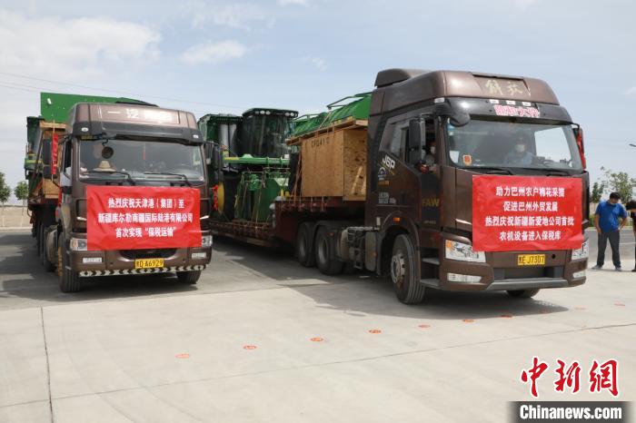 从海外进口的大型采棉机从天津港上岸后“保税运输”至新疆南疆首家保税仓库。曹莉 摄