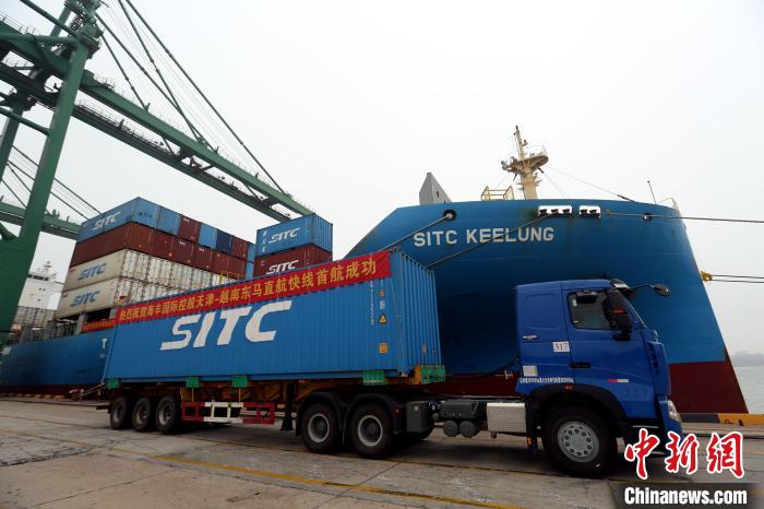 中新网天津6月12日电 (记者 张道正)12日7时,随着“海丰基隆”轮装载着第一批至越南胡志明和归仁、马来西亚民都鲁的集装箱从天津港集装箱公司开航,标志着天津港集团今年第二条“一带一路”集装箱班轮航线、天津—越南东马直航快线成功开通。
