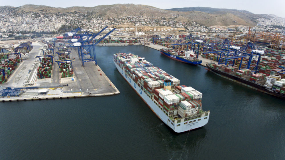 这是2017年5月7日,中远海运的货船驶出比雷埃夫斯港(比港)集装箱码头。 新华社发(帕诺斯?托马达基斯 摄)