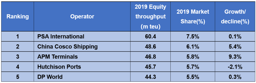 在全球码头运营商2019年集装箱权益吞吐量排名中,中远海运和APM表现抢眼。中远海运旗下的权益吞吐量为4,860万TEU,同比2018年增长5.4%,全球排名由2018年第三升至第二;APM位居第三,2019年集装箱权益吞吐量为4,680万TEU,同比2018年增长9.3%。