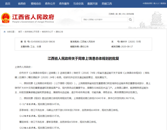 你市关于《上饶港总体规划(送审稿)》送审的请示(饶府文〔2018〕74号)和省交通运输厅关于呈报《上饶港总体规划》(报批稿)的请示(赣交港航字〔2020〕24号)收悉。经研究并征求交通运输部意见,现批复如下。