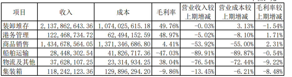 商品销售的营业收入与营业成本较上年同期减少的主要原因是唐山港之子公司国贸公司、香港国贸公司贸易业务减少所致。船舶运输、物流及其他的营业收入与营业成本较上年同期减少的主要原因是唐山港之子公司合德公司船舶运输业务减少所致。