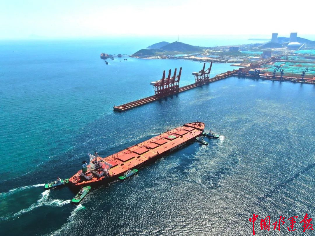 9月5日上午,山东港口烟台港矿石码头迎来载有38.56万吨铁矿的40万吨级矿石船“内比丽娜”轮,该轮型长361米,满载吃水23米,是烟台港接卸的吃水最深船舶。