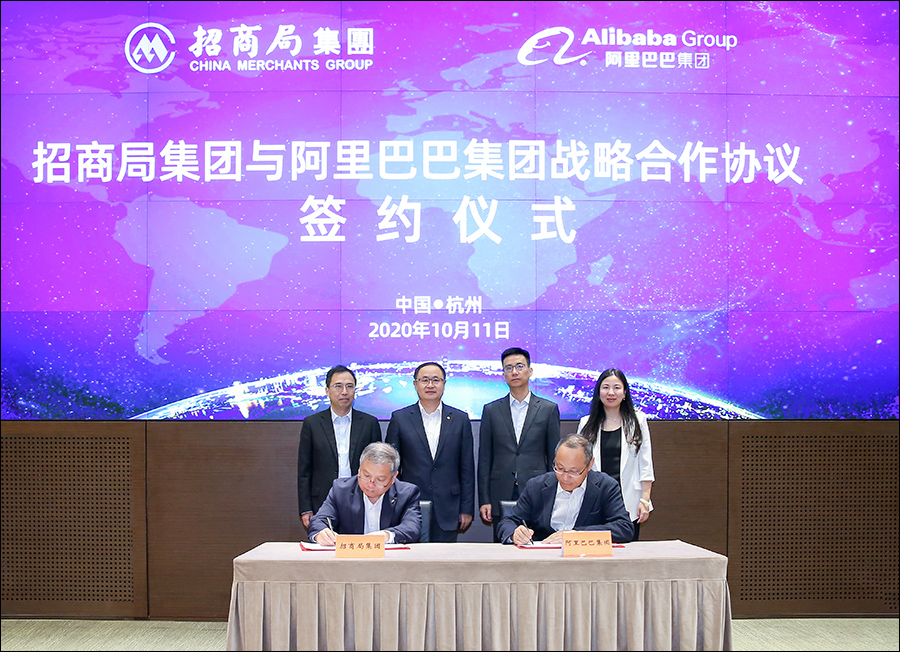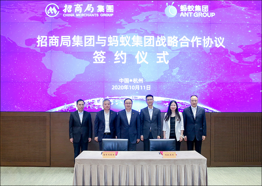 10月11日,招商局集团与阿里巴巴、蚂蚁集团在杭州签署战略合作协议。在招商局集团总经理胡建华、首席数字官张健,蚂蚁集团CEO胡晓明、阿里巴巴公共事务总裁闻佳的见证下,招商局集团副总经理王宏分别与阿里巴巴副总裁钟天华、蚂蚁集团副总裁尹铭签约。