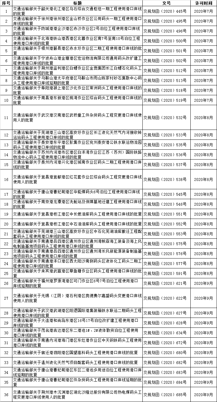 交通运输部2020年第三季度办理港口深水岸线审批情况