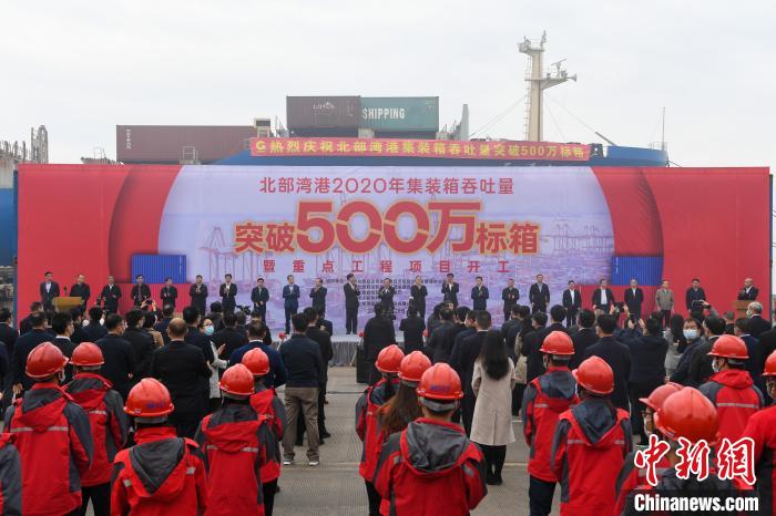 中新网钦州12月28日电 (杨陈俞靖)12月28日上午,“北部湾港2020年第500万标箱”在广西钦州港区稳稳吊起,集装箱船舶笛声长鸣。这意味着广西北部湾港2020年集装箱吞吐量突破500万标箱,跻身中国沿海港口集装箱吞吐量前10、世界前40行列。