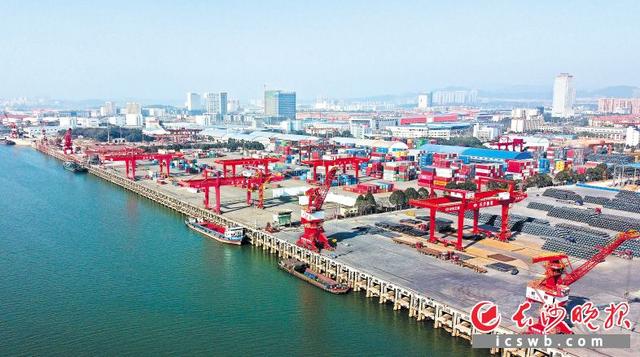 在长沙新港码头,不断有货物进出,一片繁忙景象。