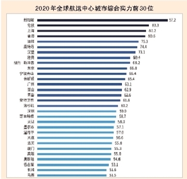 在2020年全球航运中心城市综合实力排名中,上海首次位列前三名。专家认为,上海在航运硬件和软件建设上持续发力,供应链节点功能与高端航运服务功能加速融合,最终弯道超车。