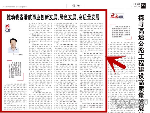 2021年1月6日,河北交通报3版发表了《推动我省港航事业创新发展、绿色发展、高质量发展》,作者系厅党组成员,省港航事业发展中心党委书记、主任唐建新。