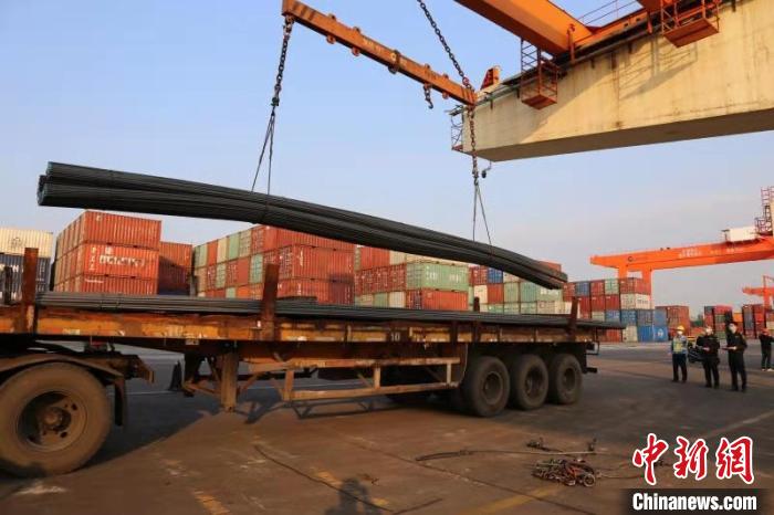 中新网贵港2月20日电(王缉琨)广西贵港海关20日介绍,春节过后,广西贵港钢铁集团有限公司出口香港的650.06吨热轧带肋合金钢筋从广西北部湾港贵港集装箱码头监管区卡口进入,货车直接驶向泊位岸边货轮实施装船作业。这标志着该关首票“抵港直装”业务顺利完成。
