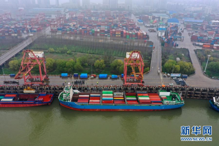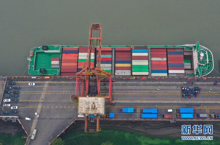 2月28日,停靠在码头的“汉海5号”准备首航驶往上海洋山港(无人机照片)。新华社发(赵军 摄)
