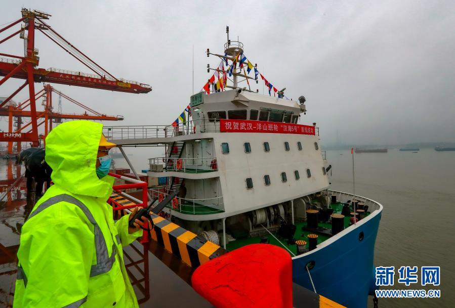 2月28日,停靠在码头的“汉海5号”准备首航驶往上海洋山港。新华社发(李海贵 摄)