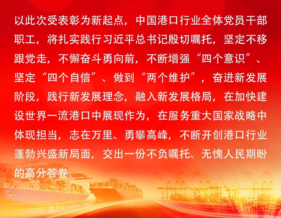 在庆祝中国共产党成立100周年之际,为表彰先进、弘扬正气,激励广大党员和各级党组织奋勇争先、建功立业,党中央决定,授予384名同志、追授16名同志全国优秀共产党员称号,授予298名同志、追授2名同志全国优秀党务工作者称号,授予499个基层党组织全国先进基层党组织称号。其中,港口行业2名个人和3个集体受到表彰。