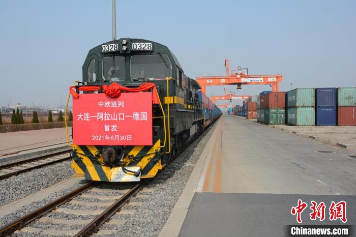 “大连—阿拉山口—德国”中欧班列在新疆阿拉山口出境,目的地为德国的汉堡、杜伊斯堡,全程计划运行18天左右。首趟班列装载了50个40尺集装箱,货物包括钢结构、服装、防护手套等物资,总货值约400万美元。
