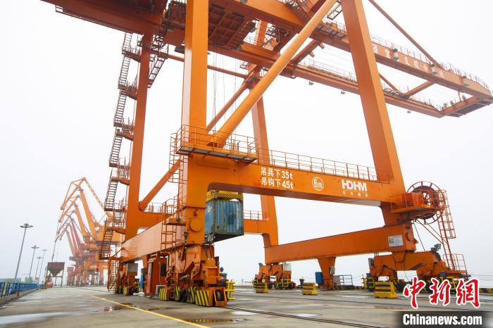 码头龙门吊正在对40英尺集装箱吊装 陈龙 摄
